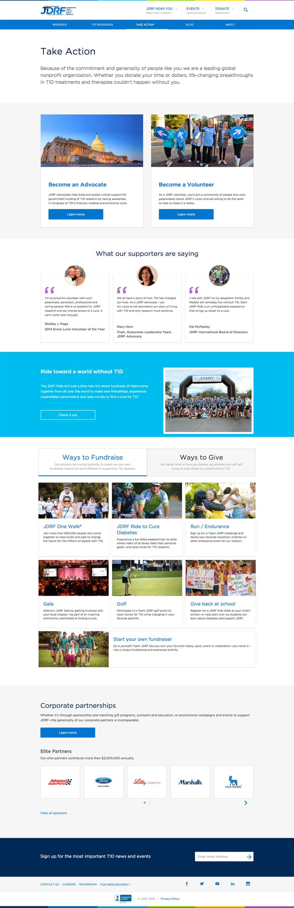 The goal for this landing page was to succinctly outline the many ways that people can get involved with JDRF and support its mission. The tone is straight-forward and inspirational.